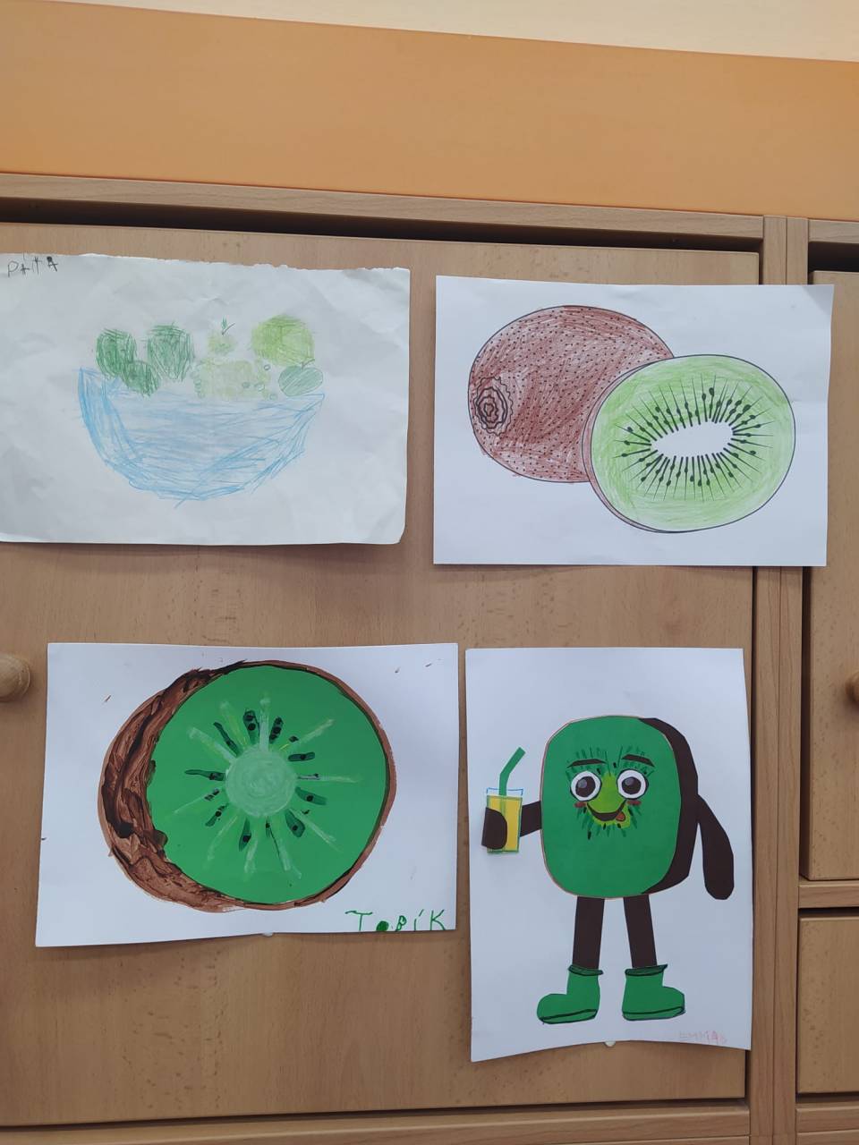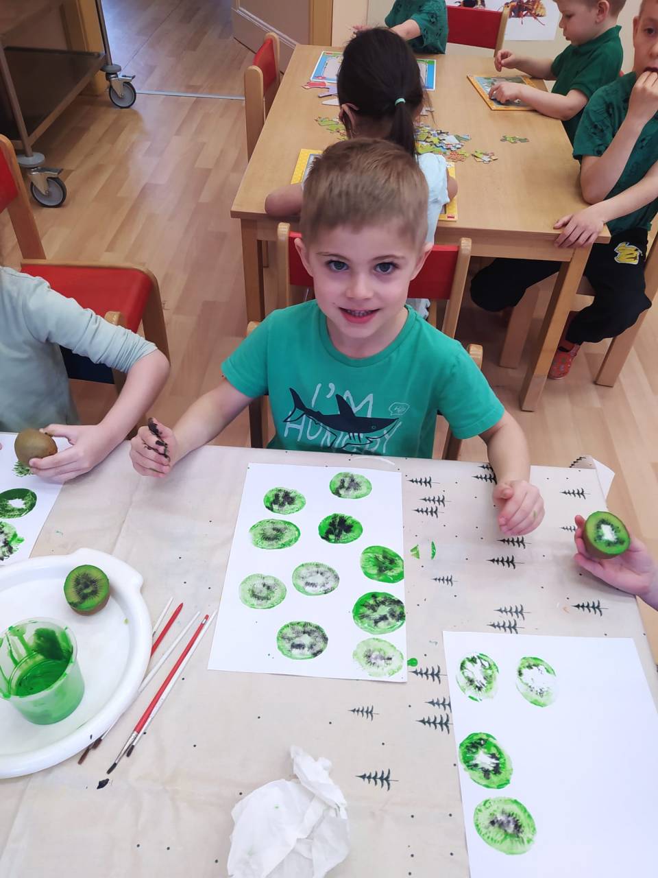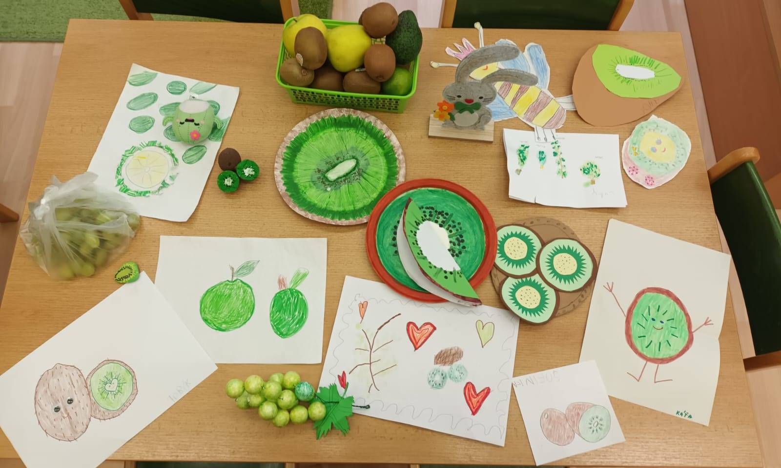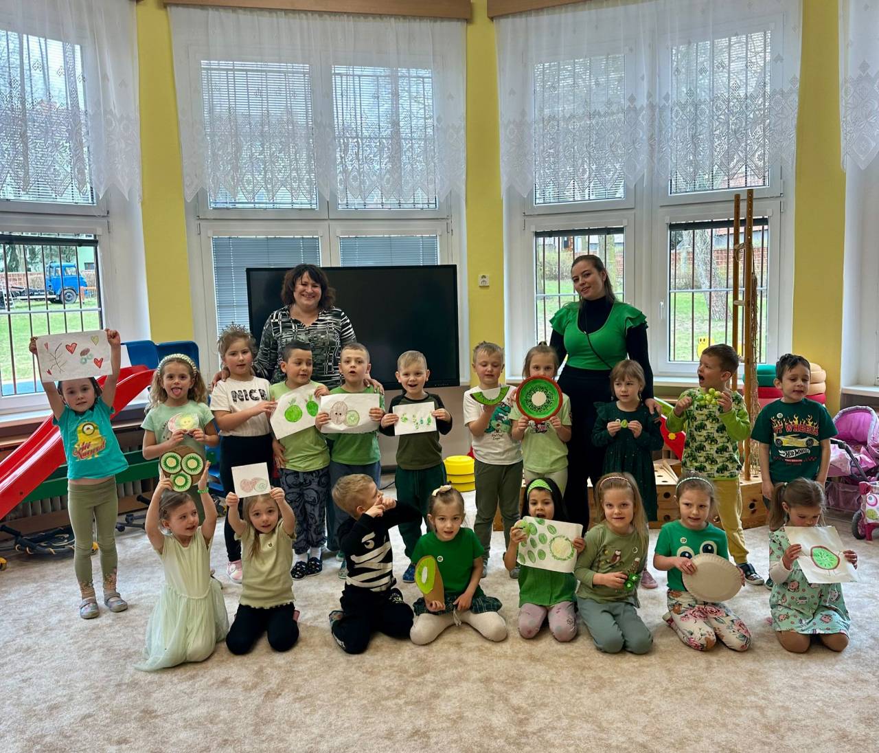 Děti přišly v zeleném oblečení, přinesly ovoce kiwi a výrobek kiwi jakoukoli technikou.