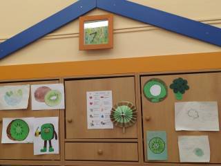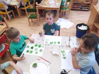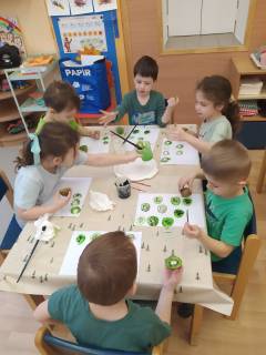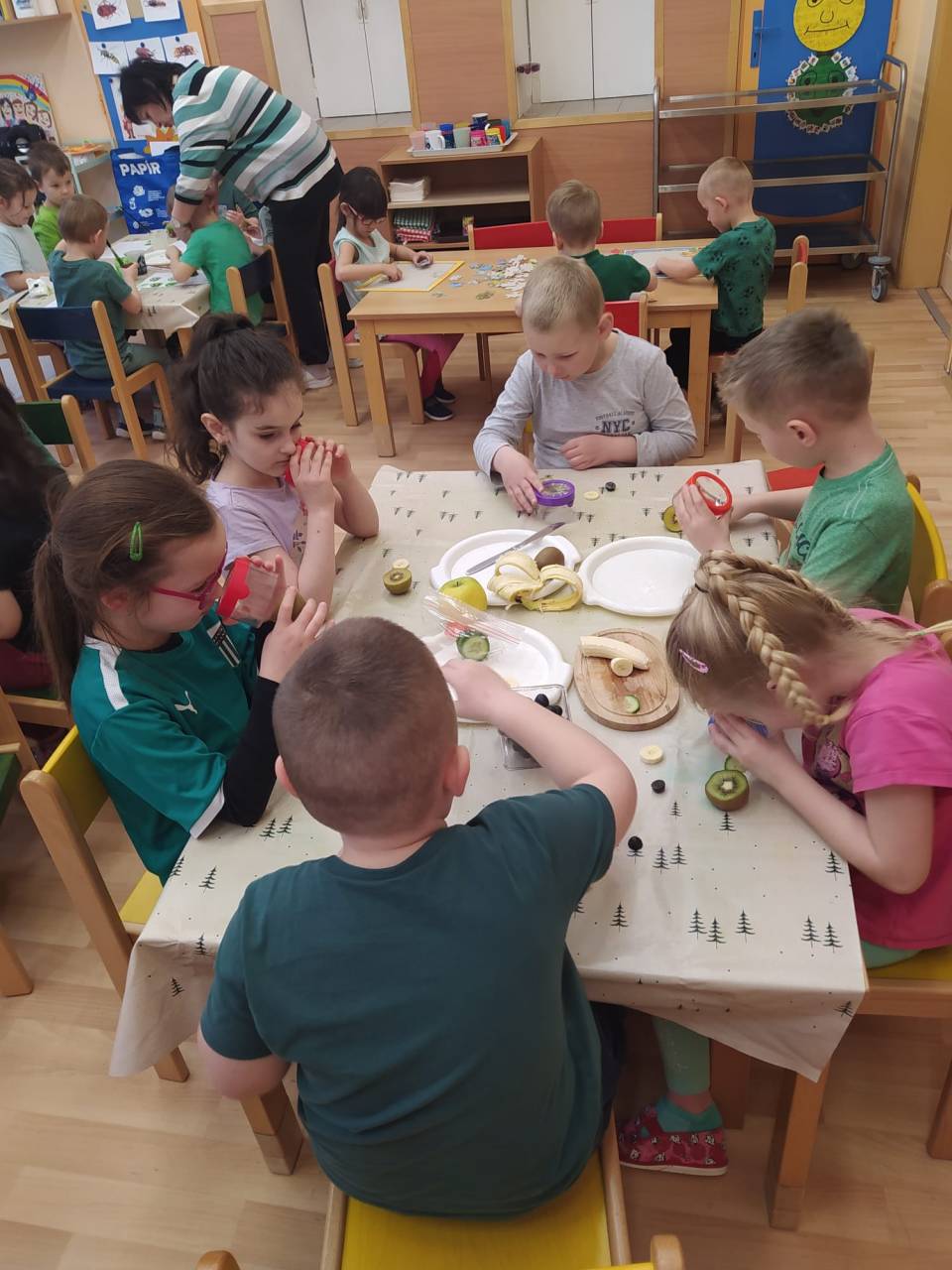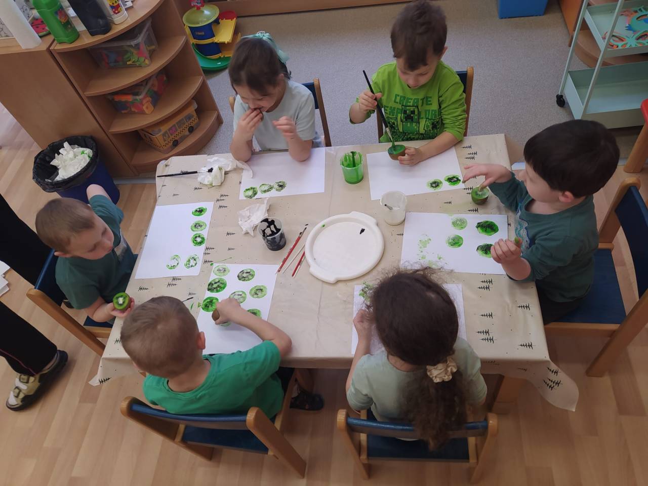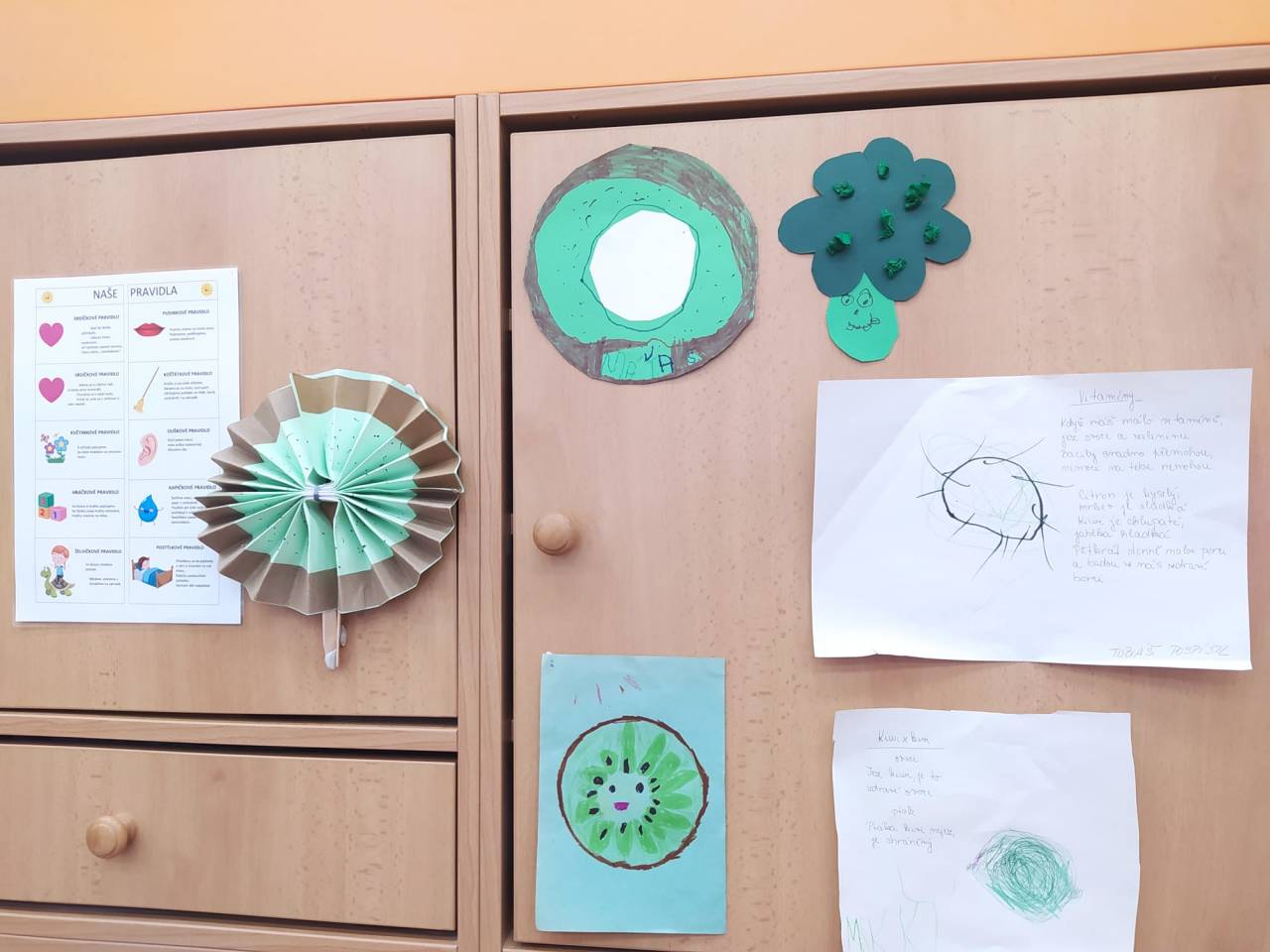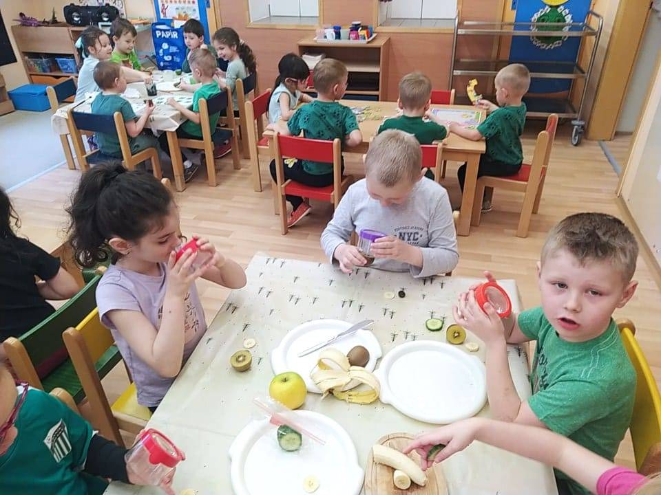 Děti přišly v zeleném oblečení, přinesly ovoce kiwi a výrobek kiwi jakoukoli technikou.