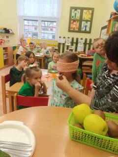 Děti přišly v oranžovém oblečení, přinesly pomeranč a výrobek daného ovoce. Společně jsme si pochutnaly na pomerančové šťávě.